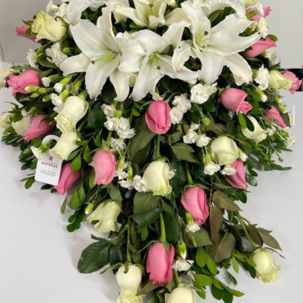 Manto grande para féretro elaborado con rosas y lirios acompañado de follaje especial.
