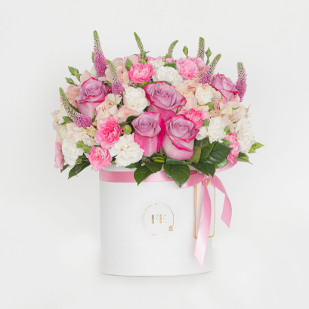 Precioso y grande arreglo elaborado en tonos rosas y blancos elaborado con rosas, minirosas, hortencias, toques de wax y flores de la estación.