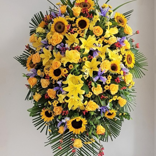 Elegante corona para condolencias en parante de metal. Altura aprox. 1.90 mt.